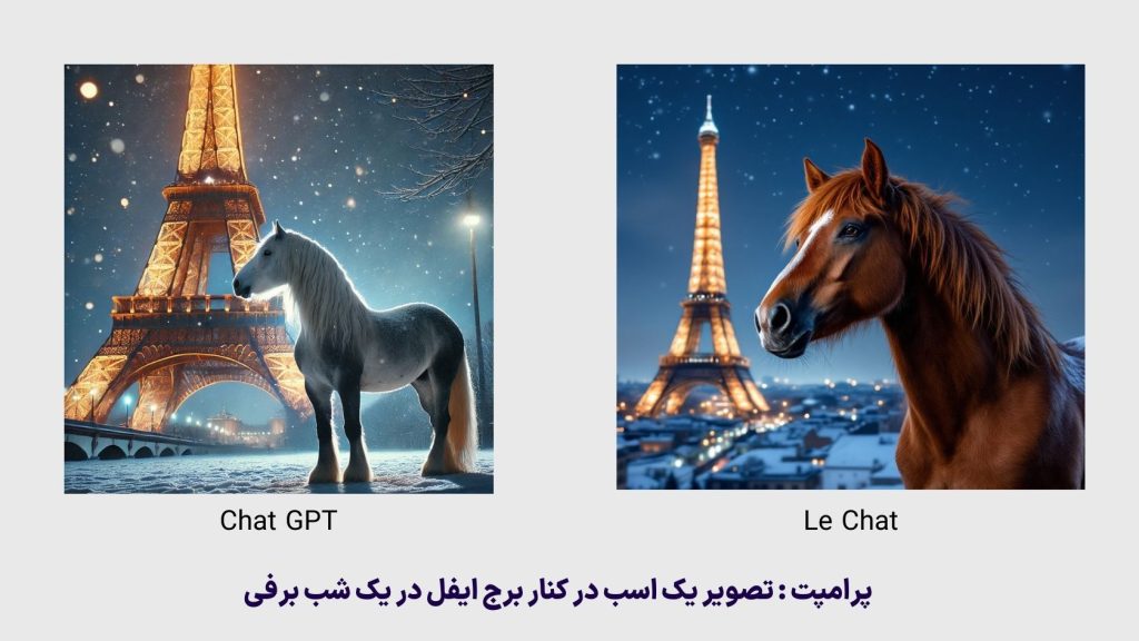 شما به راحتی میتوانید تصویر بسازید. کافیست گزینه image Generation را فعال کنید و هرچیزی که میخواهید بنویسید، تصاویر ساخته شده با این هوش مصنوعی کیفیت مناسبی دارد. برای مقایسه، با یک پرامپت مشابه، دو تصویر در Le chat و Chat GPT ساختیم. نتایج را میتوانید در تصویر زیر مشاهده کنید.